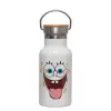 Μπομπ Σφουγγαράκης χαμόγελο, Μεταλλικό παγούρι θερμός (Stainless steel) Λευκό με ξύλινο καπακι (bamboo), διπλού τοιχώματος, 350ml