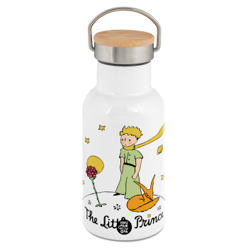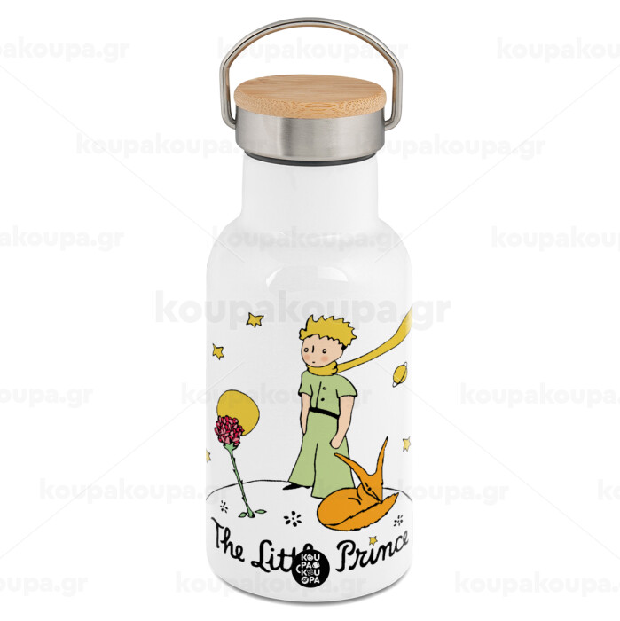Ο μικρός πρίγκιπας classic, Μεταλλικό παγούρι θερμός (Stainless steel) Λευκό με ξύλινο καπακι (bamboo), διπλού τοιχώματος, 350ml