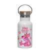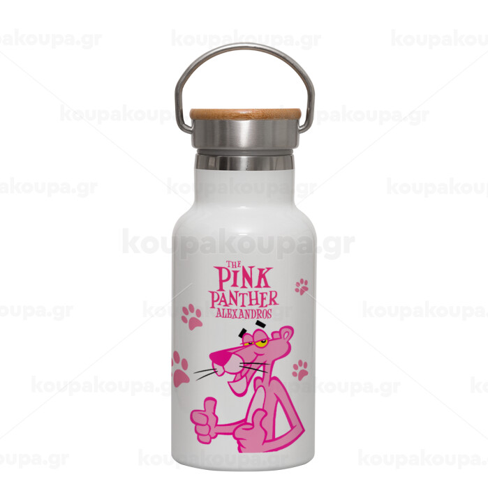 The pink panther, Μεταλλικό παγούρι θερμός (Stainless steel) Λευκό με ξύλινο καπακι (bamboo), διπλού τοιχώματος, 350ml