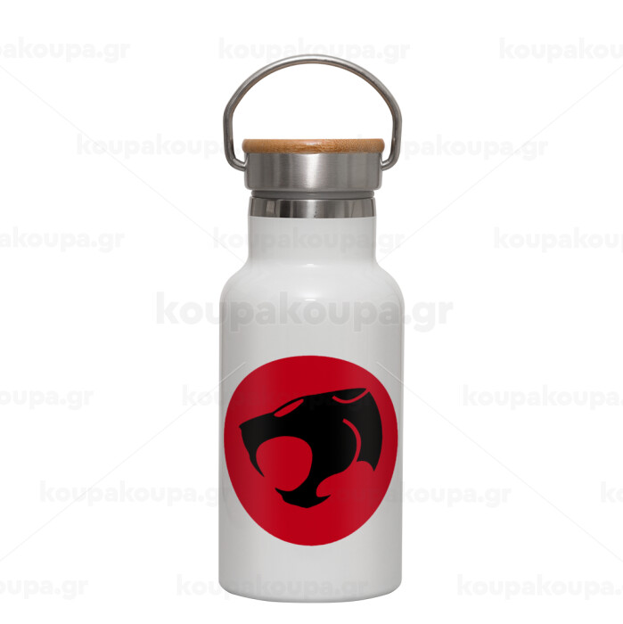 Thundercats, Μεταλλικό παγούρι θερμός (Stainless steel) Λευκό με ξύλινο καπακι (bamboo), διπλού τοιχώματος, 350ml