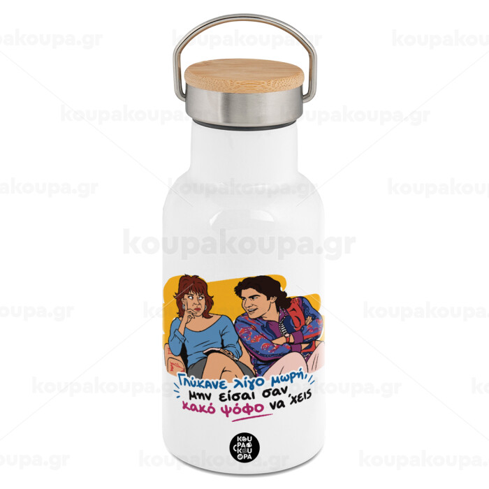 Γλύκανε λίγο, Μεταλλικό παγούρι θερμός (Stainless steel) Λευκό με ξύλινο καπακι (bamboo), διπλού τοιχώματος, 350ml