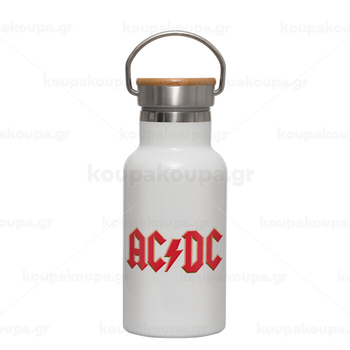 AC/DC, Μεταλλικό παγούρι θερμός (Stainless steel) Λευκό με ξύλινο καπακι (bamboo), διπλού τοιχώματος, 350ml