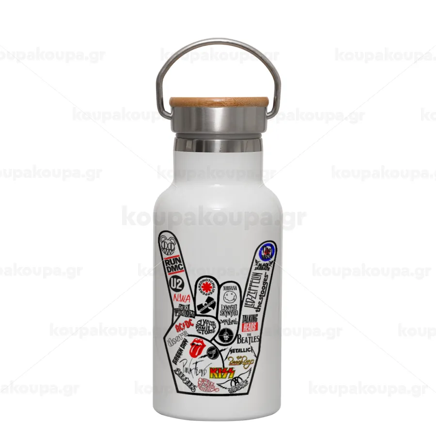 Best Rock Bands hand, Μεταλλικό παγούρι θερμός (Stainless steel) Λευκό με ξύλινο καπακι (bamboo), διπλού τοιχώματος, 350ml