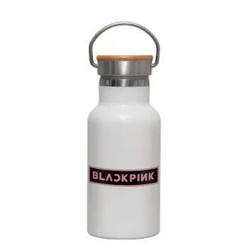 BLACKPINK, Μεταλλικό παγούρι θερμός (Stainless steel) Λευκό με ξύλινο καπακι (bamboo), διπλού τοιχώματος, 350ml