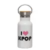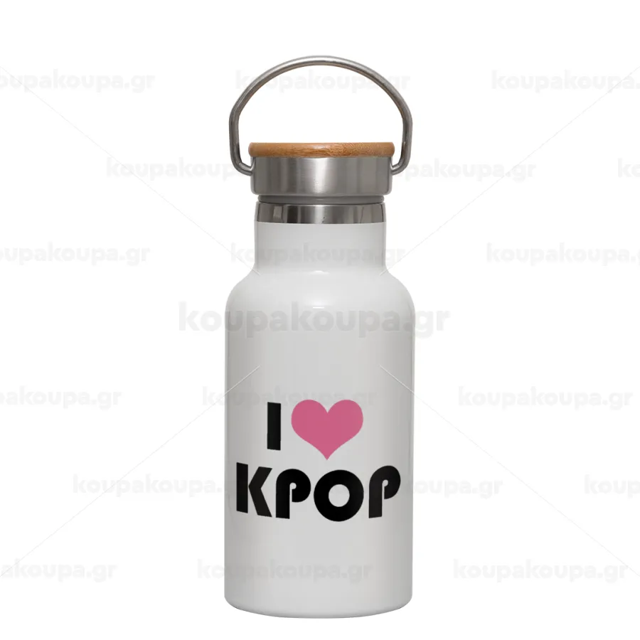 I Love KPOP, Μεταλλικό παγούρι θερμός (Stainless steel) Λευκό με ξύλινο καπακι (bamboo), διπλού τοιχώματος, 350ml