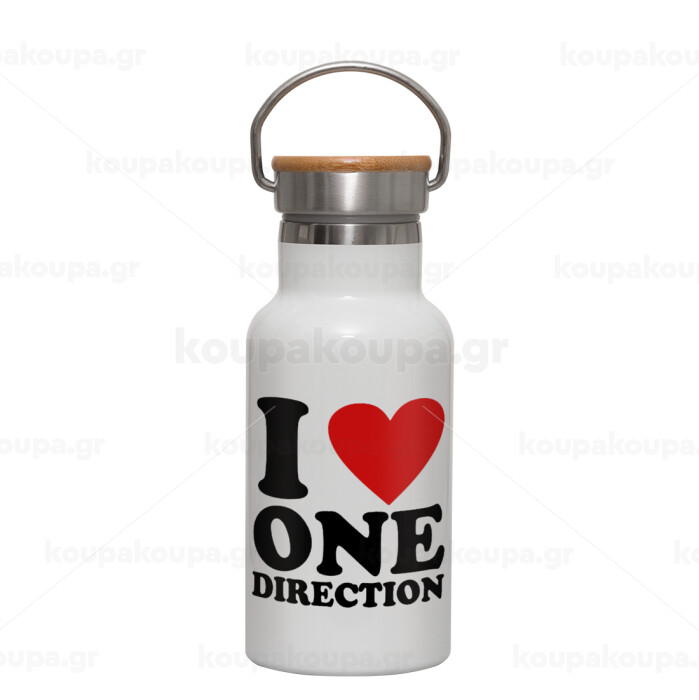 I Love, One Direction, Μεταλλικό παγούρι θερμός (Stainless steel) Λευκό με ξύλινο καπακι (bamboo), διπλού τοιχώματος, 350ml
