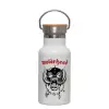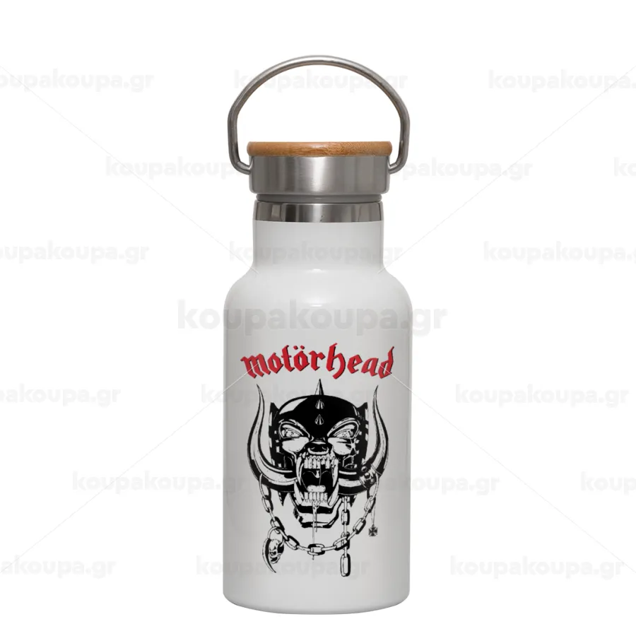 motorhead, Μεταλλικό παγούρι θερμός (Stainless steel) Λευκό με ξύλινο καπακι (bamboo), διπλού τοιχώματος, 350ml