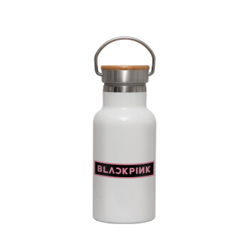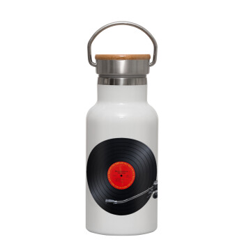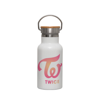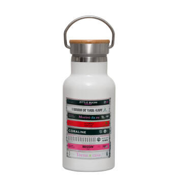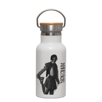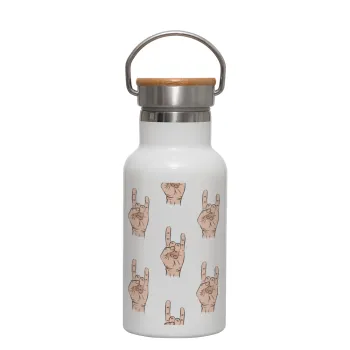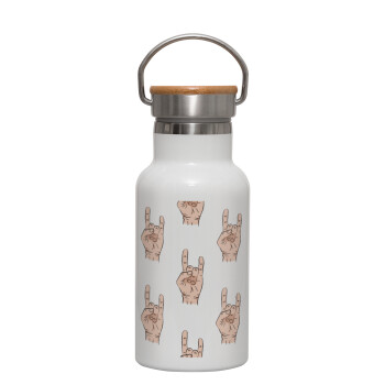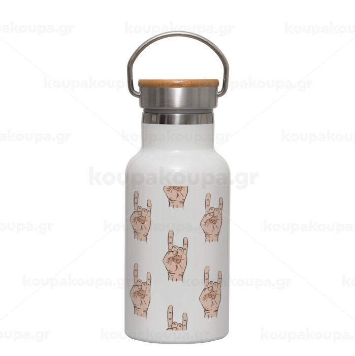 Rock hands, Μεταλλικό παγούρι θερμός (Stainless steel) Λευκό με ξύλινο καπακι (bamboo), διπλού τοιχώματος, 350ml