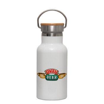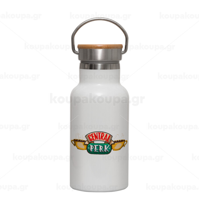 Central perk, Μεταλλικό παγούρι θερμός (Stainless steel) Λευκό με ξύλινο καπακι (bamboo), διπλού τοιχώματος, 350ml