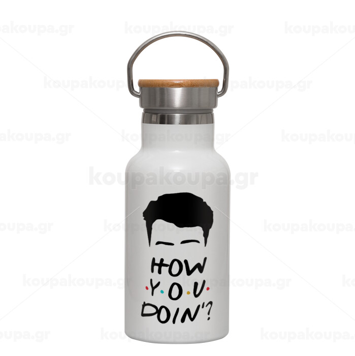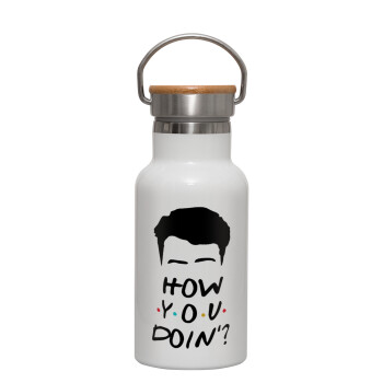 Friends how you doin?, Μεταλλικό παγούρι θερμός (Stainless steel) Λευκό με ξύλινο καπακι (bamboo), διπλού τοιχώματος, 350ml