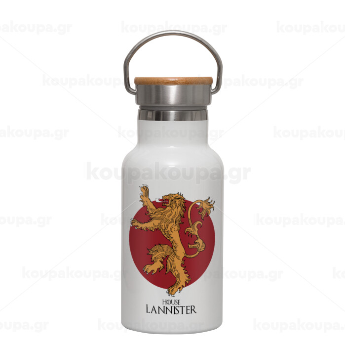 House Lannister GOT, Μεταλλικό παγούρι θερμός (Stainless steel) Λευκό με ξύλινο καπακι (bamboo), διπλού τοιχώματος, 350ml