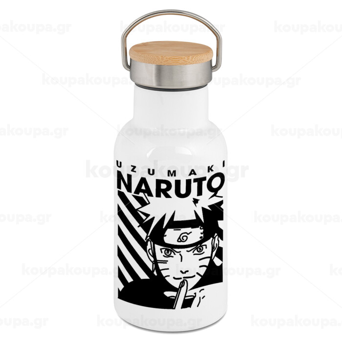 Naruto uzumaki, Μεταλλικό παγούρι θερμός (Stainless steel) Λευκό με ξύλινο καπακι (bamboo), διπλού τοιχώματος, 350ml