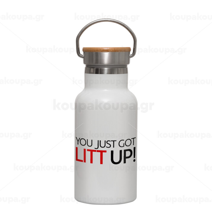 Suits You Just Got Litt Up! , Μεταλλικό παγούρι θερμός (Stainless steel) Λευκό με ξύλινο καπακι (bamboo), διπλού τοιχώματος, 350ml