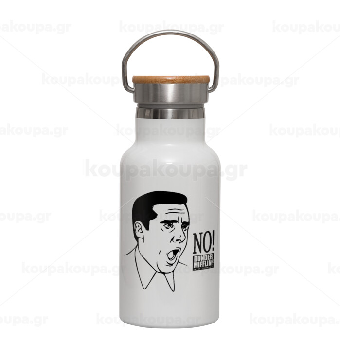 The office Michael NO!!!, Μεταλλικό παγούρι θερμός (Stainless steel) Λευκό με ξύλινο καπακι (bamboo), διπλού τοιχώματος, 350ml