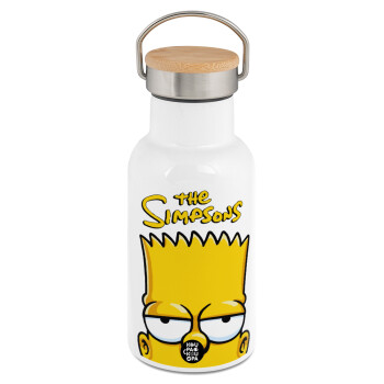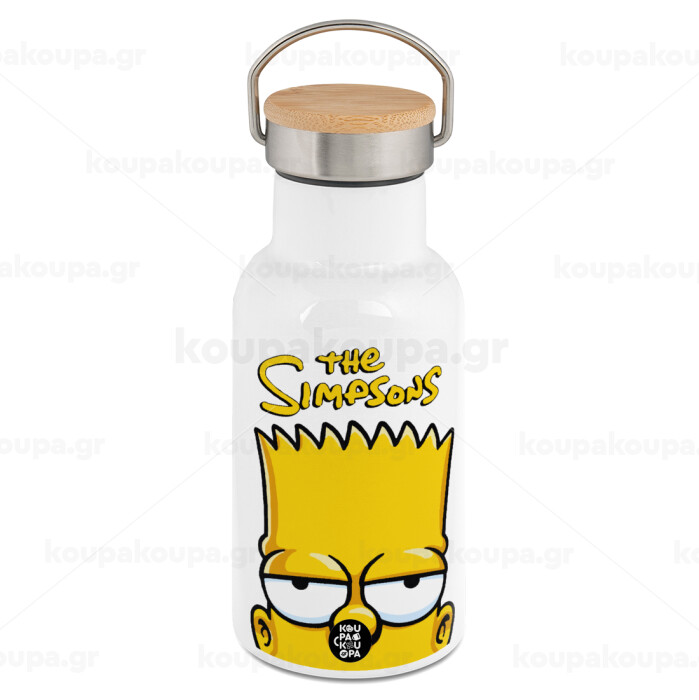 The Simpsons Bart, Μεταλλικό παγούρι θερμός (Stainless steel) Λευκό με ξύλινο καπακι (bamboo), διπλού τοιχώματος, 350ml