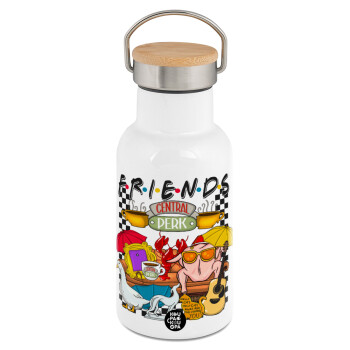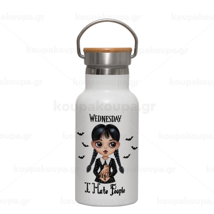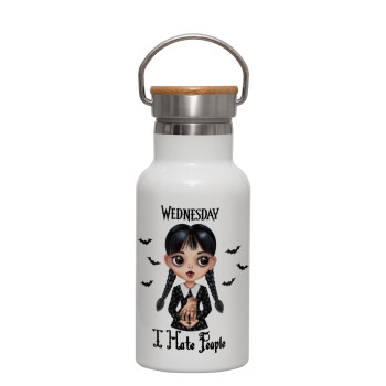 Wednesday Adams, i hate people, Μεταλλικό παγούρι θερμός (Stainless steel) Λευκό με ξύλινο καπακι (bamboo), διπλού τοιχώματος, 350ml
