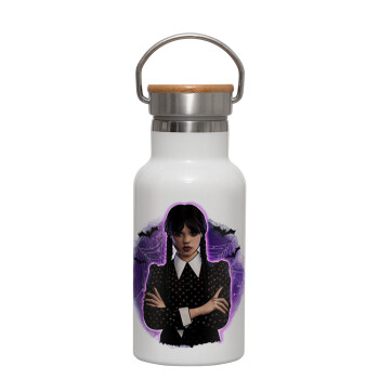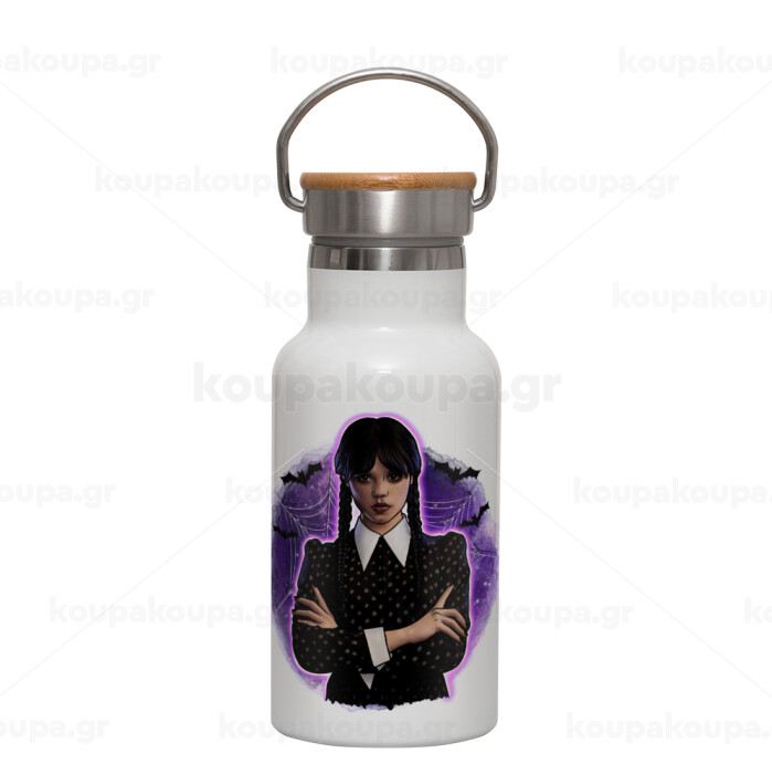 Wednesday moonlight, Μεταλλικό παγούρι θερμός (Stainless steel) Λευκό με ξύλινο καπακι (bamboo), διπλού τοιχώματος, 350ml