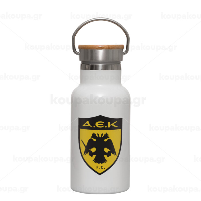 ΑΕΚ, Μεταλλικό παγούρι θερμός (Stainless steel) Λευκό με ξύλινο καπακι (bamboo), διπλού τοιχώματος, 350ml