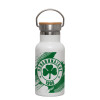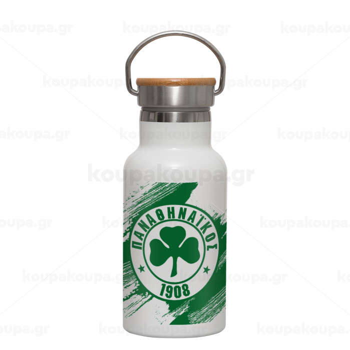 Π.Α.Ο., Μεταλλικό παγούρι θερμός (Stainless steel) Λευκό με ξύλινο καπακι (bamboo), διπλού τοιχώματος, 350ml