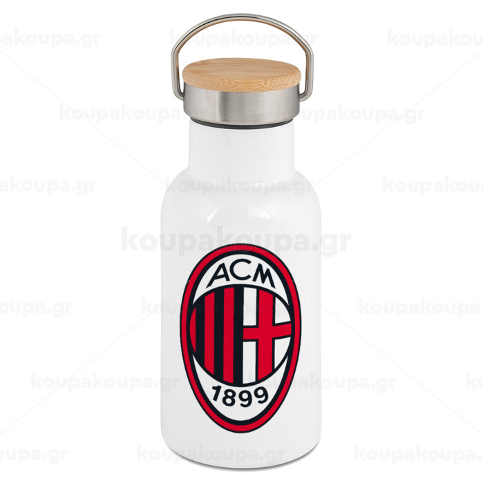 ACM, Μεταλλικό παγούρι θερμός (Stainless steel) Λευκό με ξύλινο καπακι (bamboo), διπλού τοιχώματος, 350ml