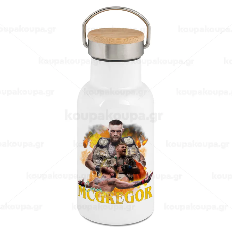 Conor McGregor Notorious, Μεταλλικό παγούρι θερμός (Stainless steel) Λευκό με ξύλινο καπακι (bamboo), διπλού τοιχώματος, 350ml