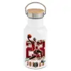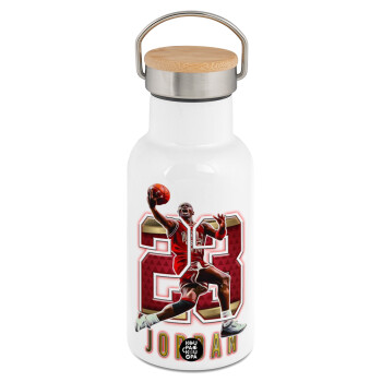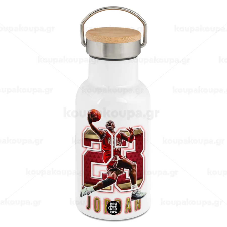 Jordan 23, Μεταλλικό παγούρι θερμός (Stainless steel) Λευκό με ξύλινο καπακι (bamboo), διπλού τοιχώματος, 350ml