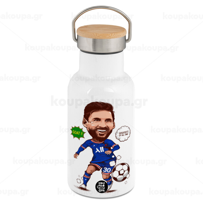 Lionel Messi drawing, Μεταλλικό παγούρι θερμός (Stainless steel) Λευκό με ξύλινο καπακι (bamboo), διπλού τοιχώματος, 350ml
