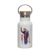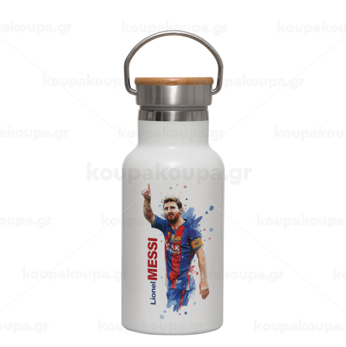 Λιονέλ Μέσι, Μεταλλικό παγούρι θερμός (Stainless steel) Λευκό με ξύλινο καπακι (bamboo), διπλού τοιχώματος, 350ml