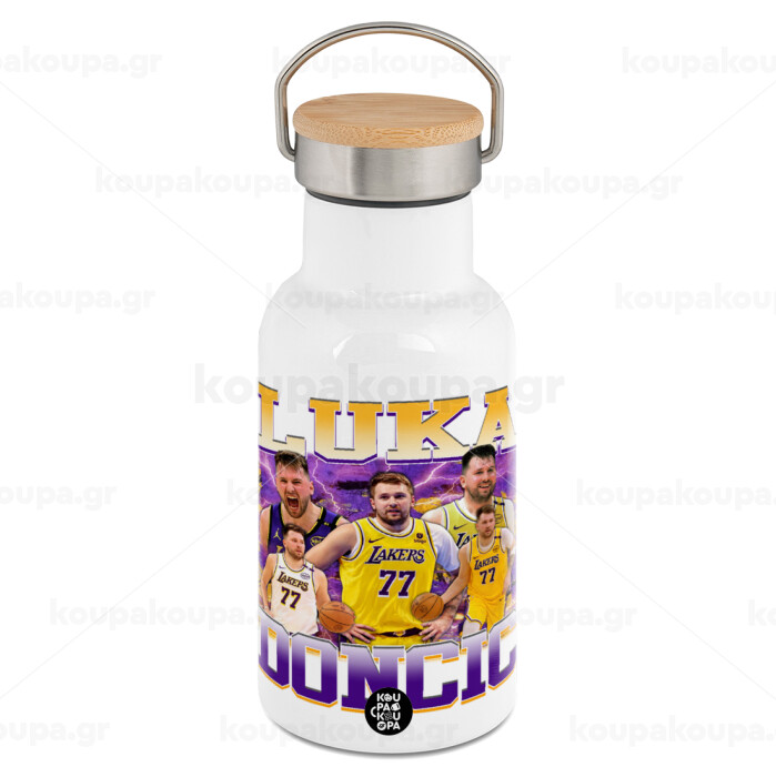 Luka Doncic Basketball , Μεταλλικό παγούρι θερμός (Stainless steel) Λευκό με ξύλινο καπακι (bamboo), διπλού τοιχώματος, 350ml
