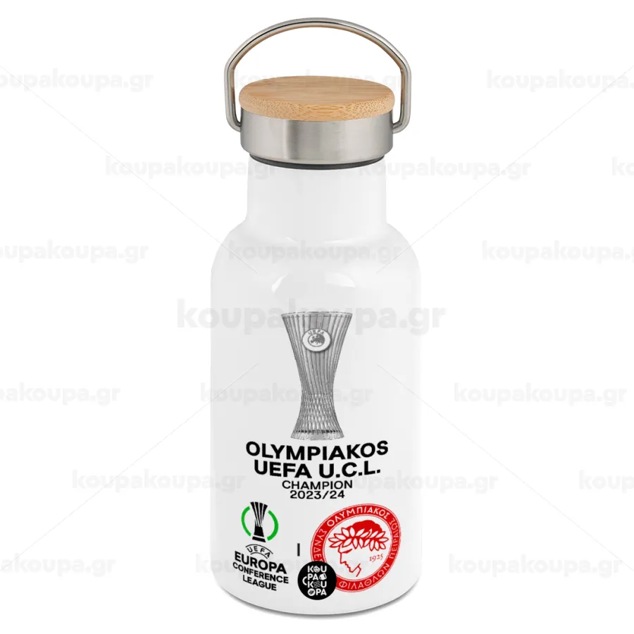 Ολυμπιακός νικητής UEFA Europa Conference League Champion 2023/24, Μεταλλικό παγούρι θερμός (Stainless steel) Λευκό με ξύλινο καπακι (bamboo), διπλού τοιχώματος, 350ml