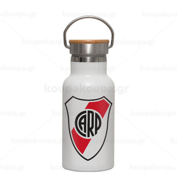 River Plate, Μεταλλικό παγούρι θερμός (Stainless steel) Λευκό με ξύλινο καπακι (bamboo), διπλού τοιχώματος, 350ml
