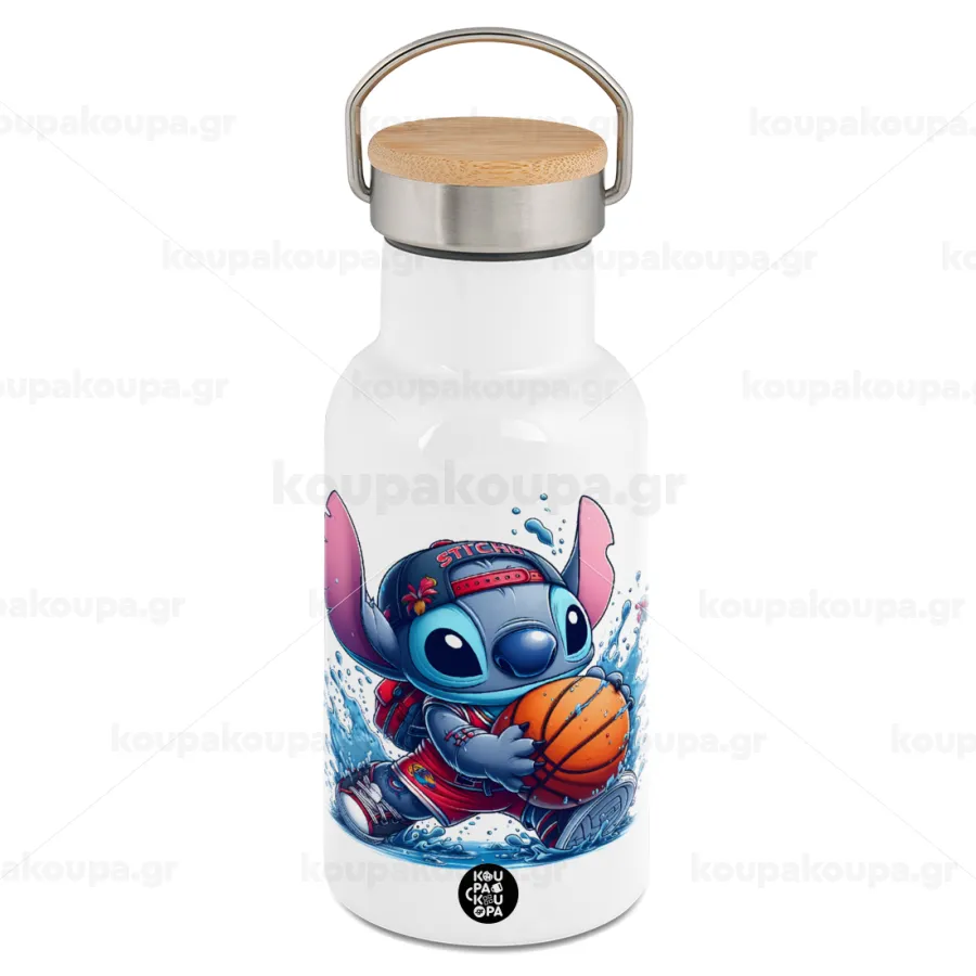 Stitch Basketball, Μεταλλικό παγούρι θερμός (Stainless steel) Λευκό με ξύλινο καπακι (bamboo), διπλού τοιχώματος, 350ml