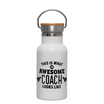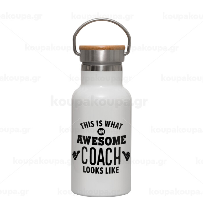 This is what an awesome COACH looks like!, Μεταλλικό παγούρι θερμός (Stainless steel) Λευκό με ξύλινο καπακι (bamboo), διπλού τοιχώματος, 350ml