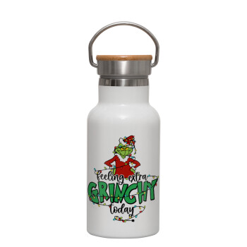 Grinch Feeling Extra Grinchy Today, Μεταλλικό παγούρι θερμός (Stainless steel) Λευκό με ξύλινο καπακι (bamboo), διπλού τοιχώματος, 350ml