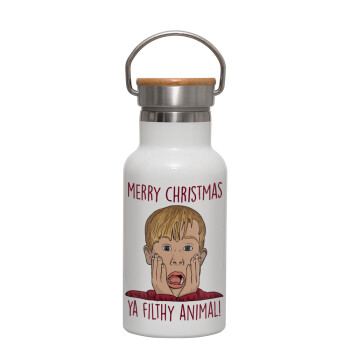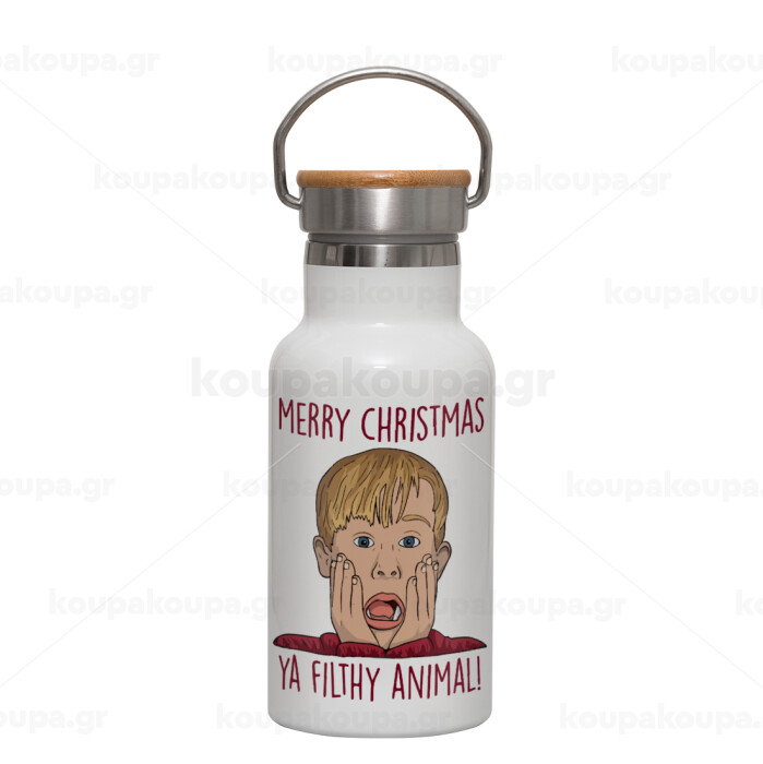home alone, Merry Christmas ya filthy animal, Μεταλλικό παγούρι θερμός (Stainless steel) Λευκό με ξύλινο καπακι (bamboo), διπλού τοιχώματος, 350ml