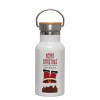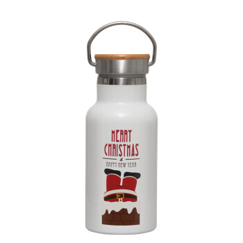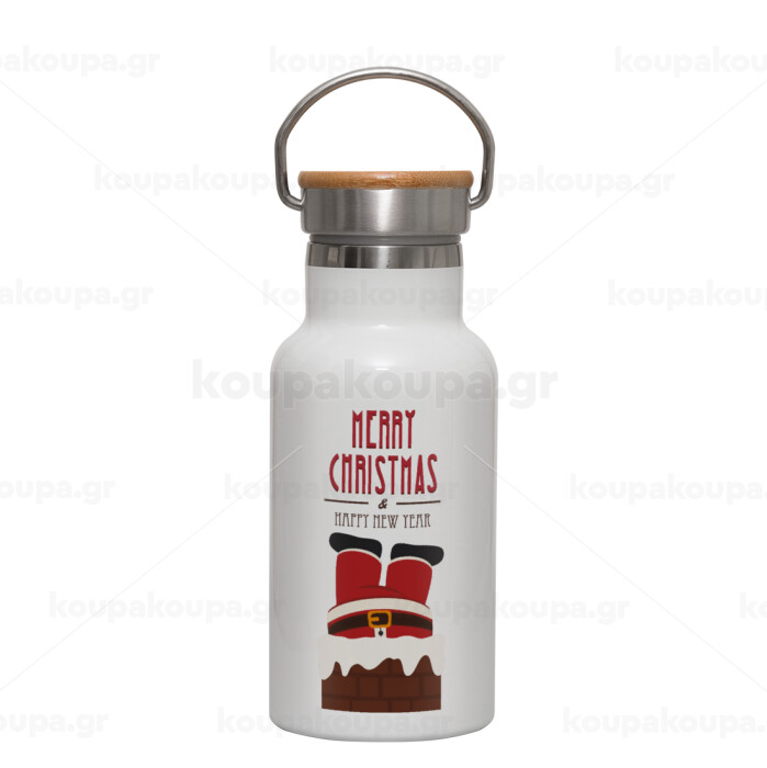 Merry christmas chimney, Μεταλλικό παγούρι θερμός (Stainless steel) Λευκό με ξύλινο καπακι (bamboo), διπλού τοιχώματος, 350ml
