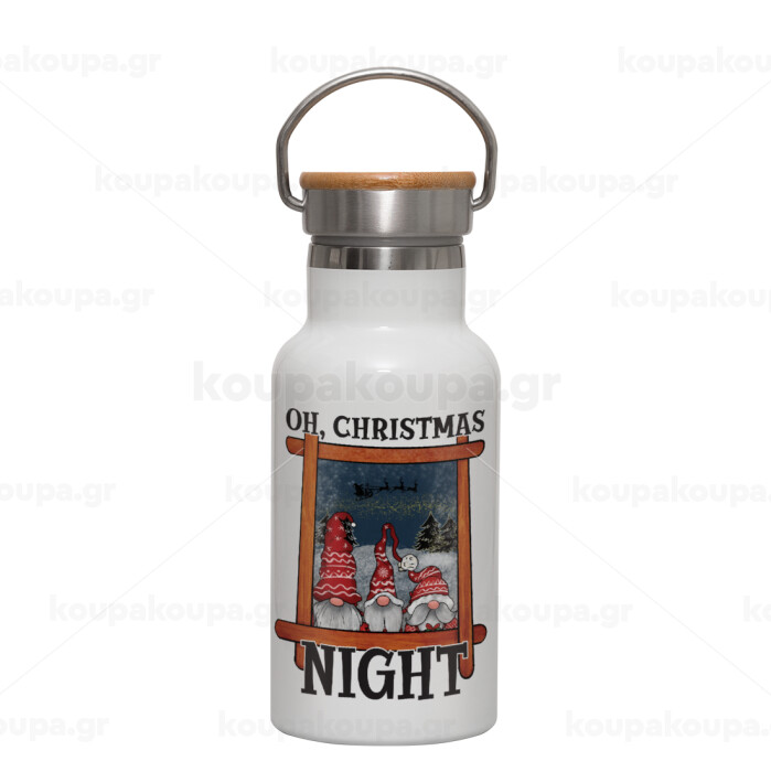 Oh Christmas Night, Μεταλλικό παγούρι θερμός (Stainless steel) Λευκό με ξύλινο καπακι (bamboo), διπλού τοιχώματος, 350ml