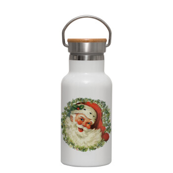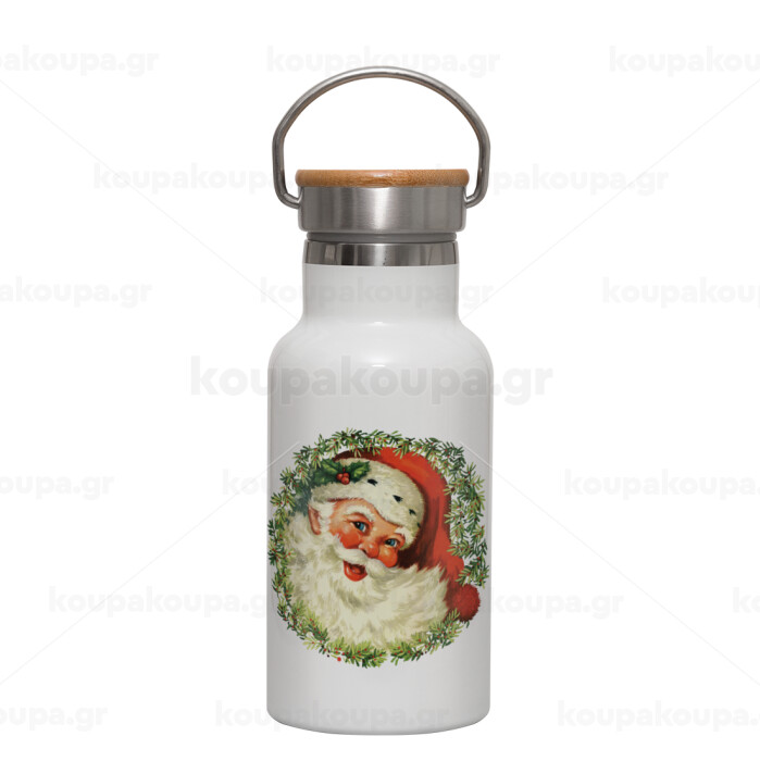 Santa Claus, Μεταλλικό παγούρι θερμός (Stainless steel) Λευκό με ξύλινο καπακι (bamboo), διπλού τοιχώματος, 350ml
