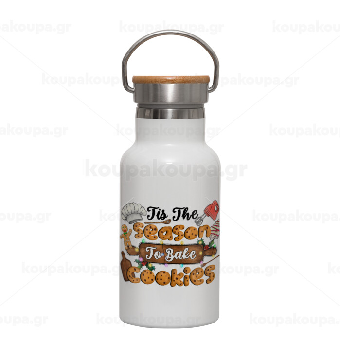 Tis The Season To Bake Cookies, Μεταλλικό παγούρι θερμός (Stainless steel) Λευκό με ξύλινο καπακι (bamboo), διπλού τοιχώματος, 350ml