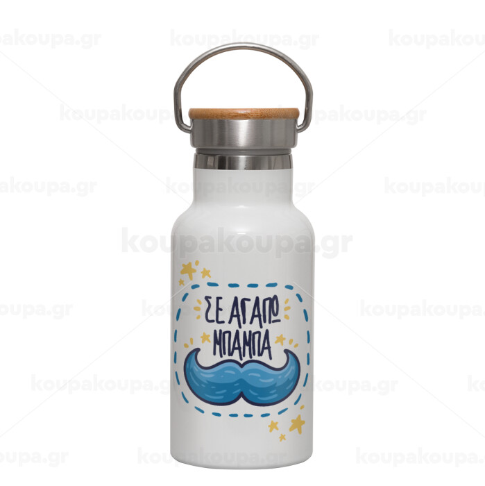 Σε αγαπώ μπαμπά!!!, Μεταλλικό παγούρι θερμός (Stainless steel) Λευκό με ξύλινο καπακι (bamboo), διπλού τοιχώματος, 350ml
