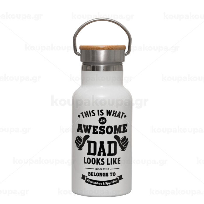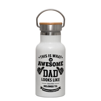 This is what an Awesome DAD looks like, Μεταλλικό παγούρι θερμός (Stainless steel) Λευκό με ξύλινο καπακι (bamboo), διπλού τοιχώματος, 350ml