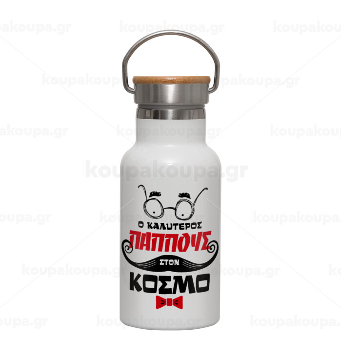 Ο καλύτερος παππούς του κόσμου!, Μεταλλικό παγούρι θερμός (Stainless steel) Λευκό με ξύλινο καπακι (bamboo), διπλού τοιχώματος, 350ml