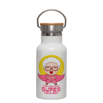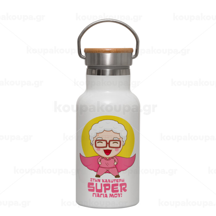 Στην καλύτερη Super γιαγιά μου!, Μεταλλικό παγούρι θερμός (Stainless steel) Λευκό με ξύλινο καπακι (bamboo), διπλού τοιχώματος, 350ml