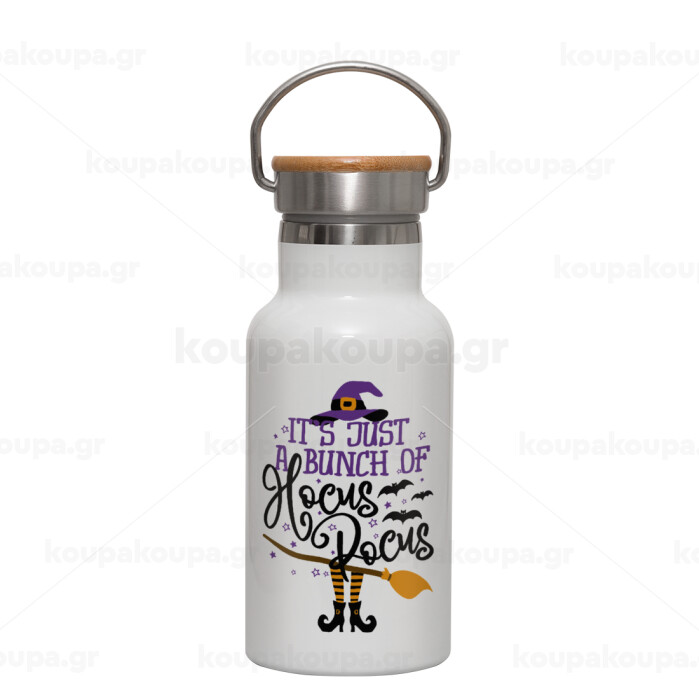 It's just a bunch of hocus pocus - halloween, Μεταλλικό παγούρι θερμός (Stainless steel) Λευκό με ξύλινο καπακι (bamboo), διπλού τοιχώματος, 350ml
