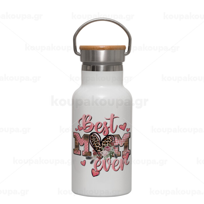 Best mom ever Mother's Day, Μεταλλικό παγούρι θερμός (Stainless steel) Λευκό με ξύλινο καπακι (bamboo), διπλού τοιχώματος, 350ml