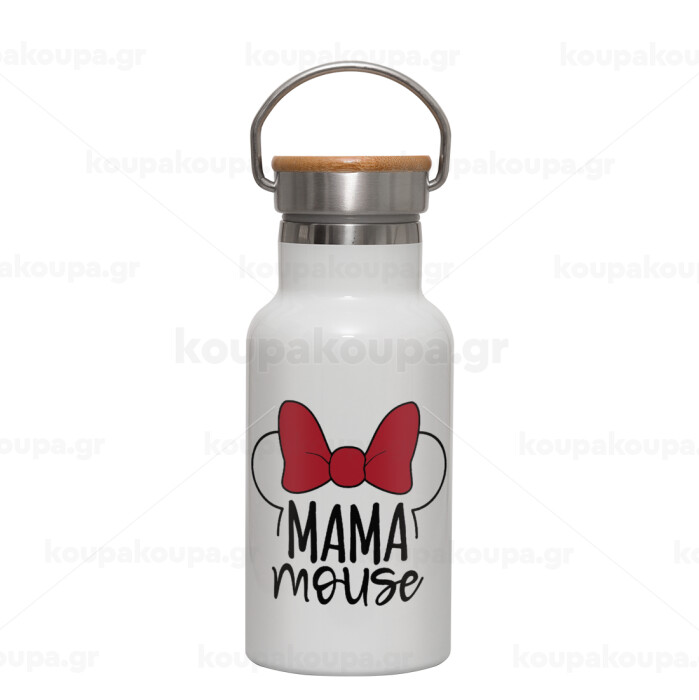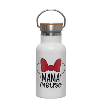 MAMA mouse, Μεταλλικό παγούρι θερμός (Stainless steel) Λευκό με ξύλινο καπακι (bamboo), διπλού τοιχώματος, 350ml