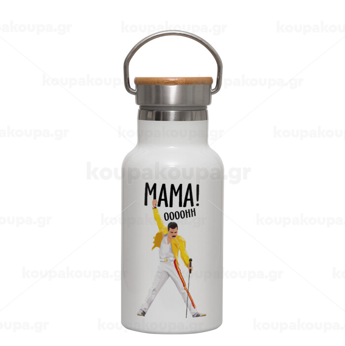 mama ooohh!, Μεταλλικό παγούρι θερμός (Stainless steel) Λευκό με ξύλινο καπακι (bamboo), διπλού τοιχώματος, 350ml