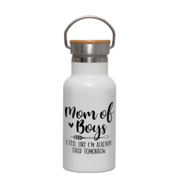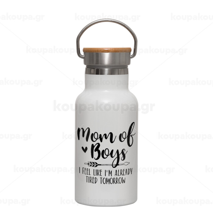 Mom of boys i feel like im already tired tomorrow, Μεταλλικό παγούρι θερμός (Stainless steel) Λευκό με ξύλινο καπακι (bamboo), διπλού τοιχώματος, 350ml