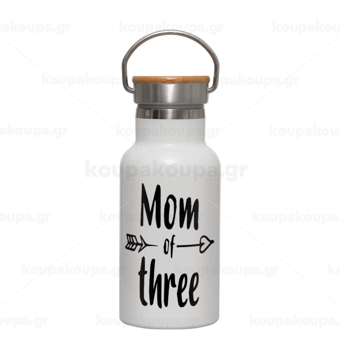 Mom of three, Μεταλλικό παγούρι θερμός (Stainless steel) Λευκό με ξύλινο καπακι (bamboo), διπλού τοιχώματος, 350ml