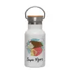 Super mom, Μεταλλικό παγούρι θερμός (Stainless steel) Λευκό με ξύλινο καπακι (bamboo), διπλού τοιχώματος, 350ml
